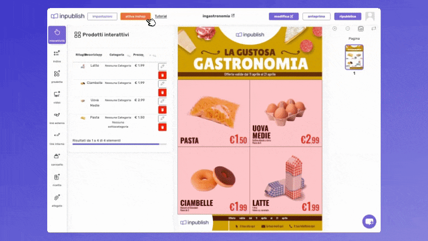Con Inpublish, puoi creare da zero volantini e cataloghi digitali interattivi, oppure caricare un PDF e renderlo interattivo in pochi minuti. Grazie alla nostra piattaforma, hai a disposizione tutti gli strumenti necessari per semplificare la gestione delle tue promozioni, aumentare la visibilità dei tuoi prodotti e facilitare l’acquisto da parte dei tuoi clienti.